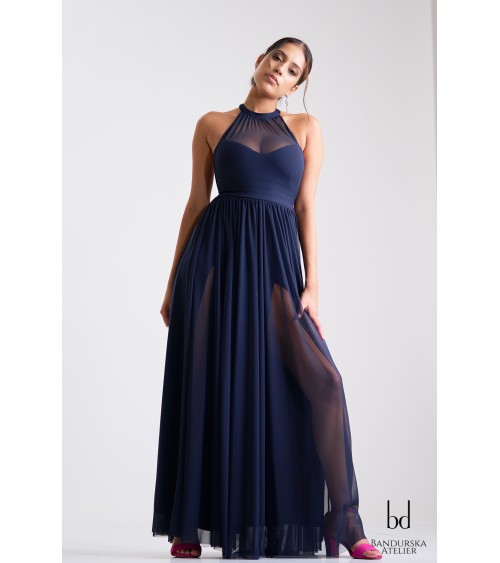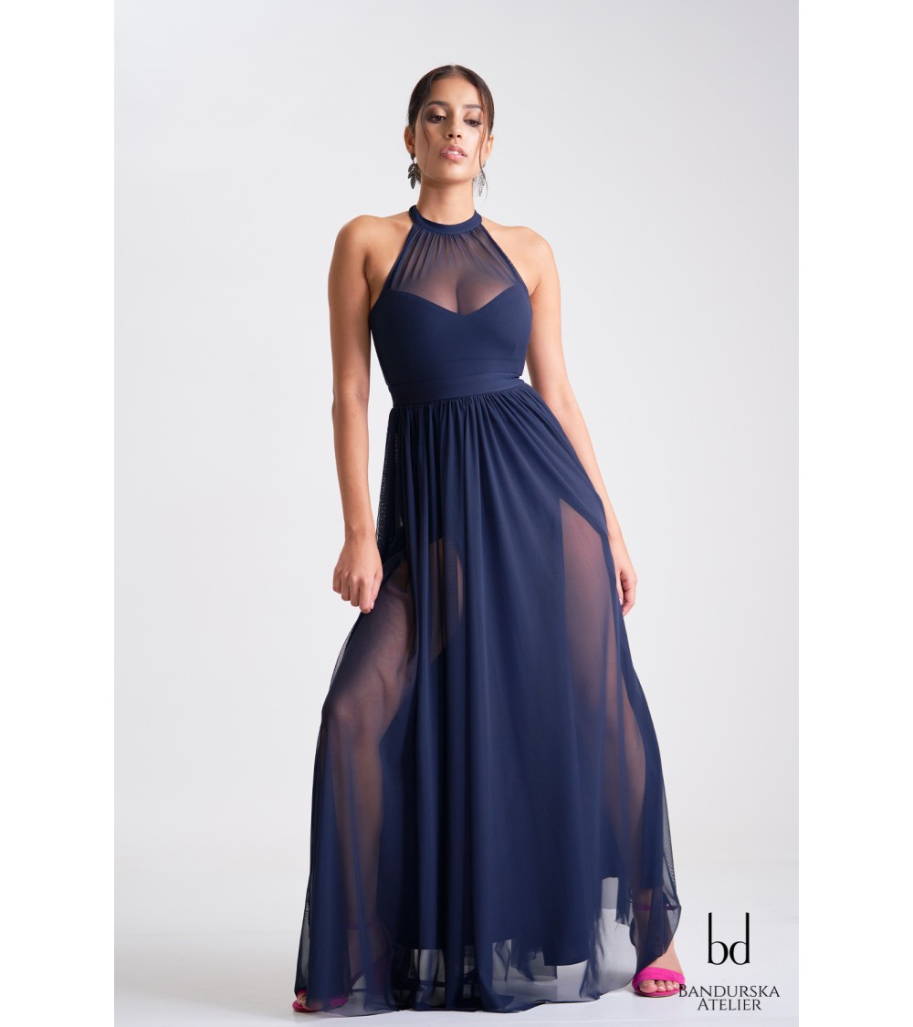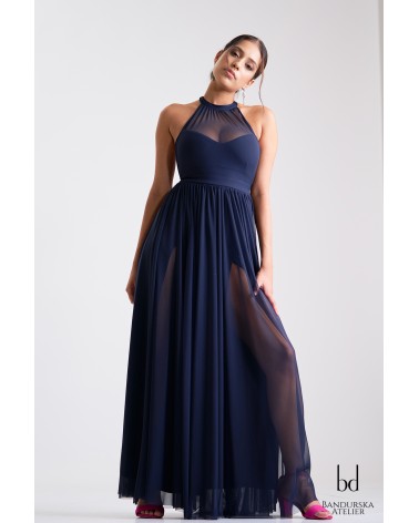 Długa sukienka z krytym zamkiem i fiszbinami w górnej części.
